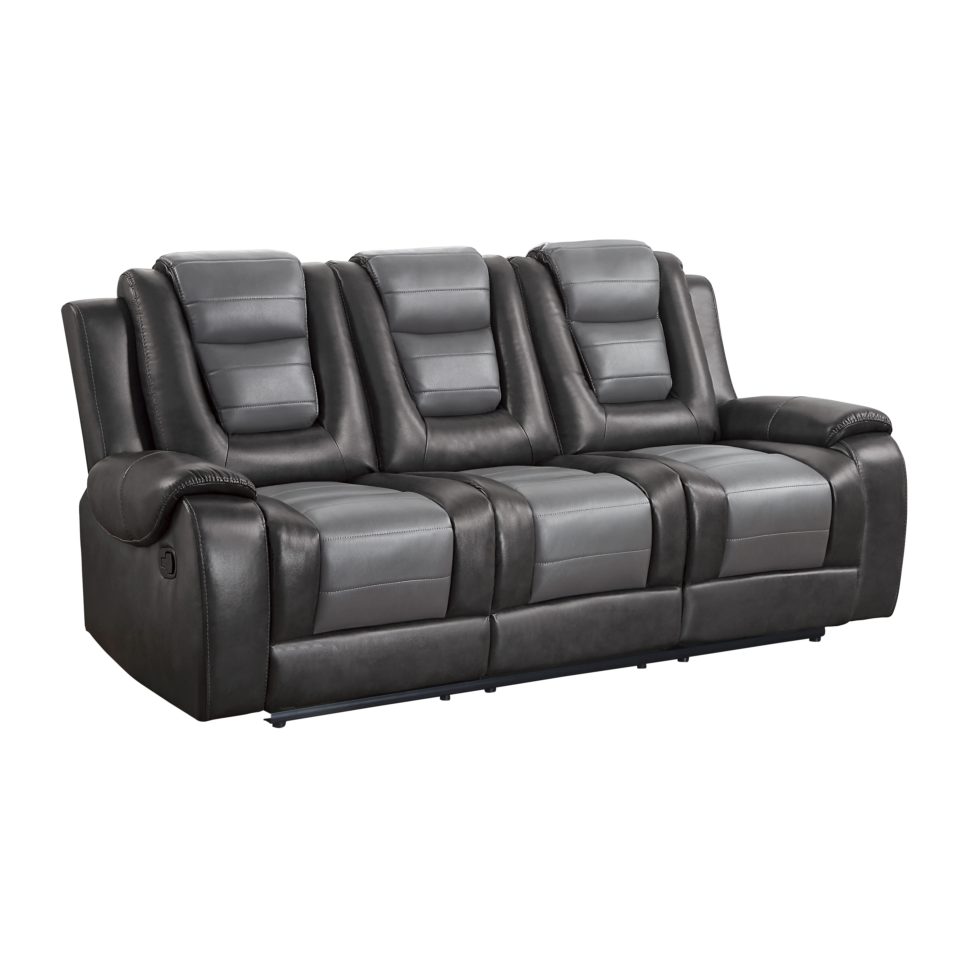 With well-appointed features that create not only a comfortable seating experience but a functional one as well, the Briscoe Collection will be a welcome addition to your home. The gray premium faux leather covering creates a style that will blend effortlessly with your transitional decorative preference. The sofa features dual reclining ends and a drop down center seat back with cup-holders and tabletop, features manual motion mechanisms operating with the pull of a side-mounted tab, that once engaged, take you from seated to reclined in an easy motion.