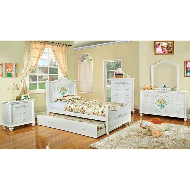 Bright white with flowers painted and a delicate heart motif, these details are a perfect fit for any girl. This trundle with ornate pulls is the easiest way to add another bed and more storage to the room.
